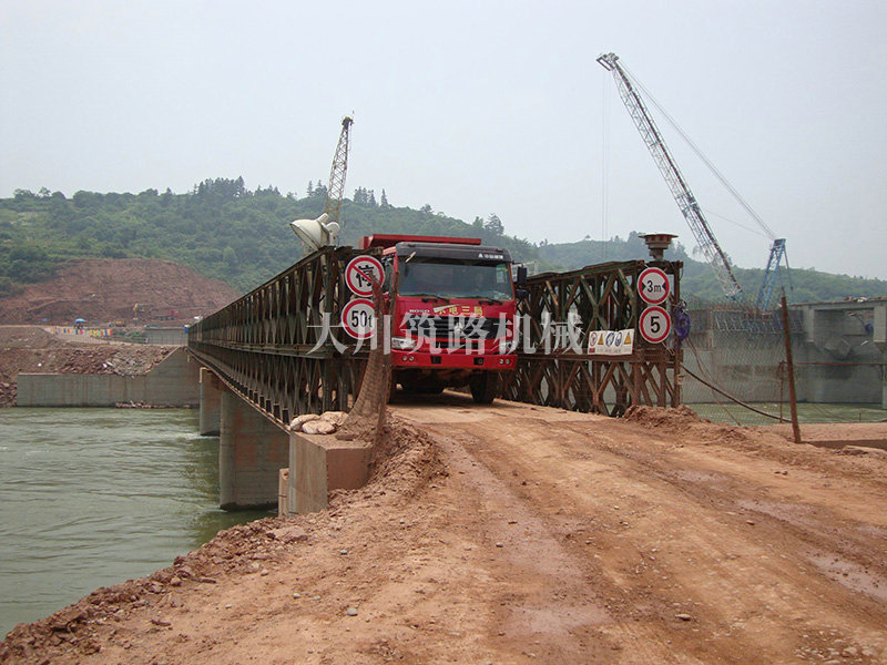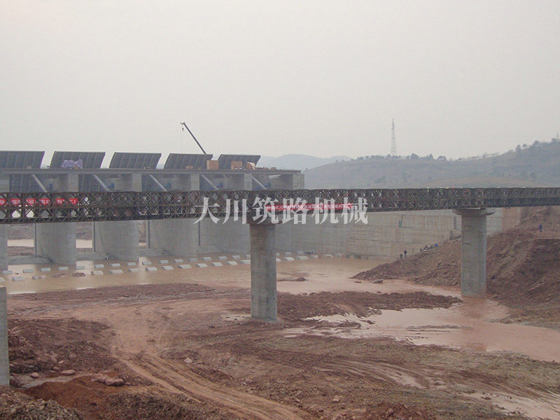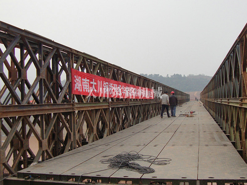 特點(diǎn):滿(mǎn)足荷載50T施工車(chē)輛的通行要求。本鋼橋安裝條件復(fù)雜,工期特別緊,我公司精心安排,合理組織,按時(shí)完成了安裝任務(wù)。采用推出吊裝法和推出法結(jié)合安裝,安裝周期23天,通過(guò)中南大學(xué)下屬專(zhuān)業(yè)檢測(cè)機(jī)構(gòu)檢測(cè)。