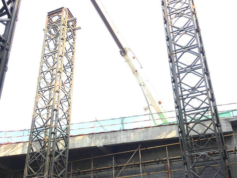 基本情況:部分構(gòu)件工廠組裝好,分片運輸至現(xiàn)場。采用4片321型貝雷片組合而成的貝雷方柱作為大跨度鋼桁架下部的臨時支撐胎架,待上部鋼桁架安裝完成后分級卸載,最后分片拆除。拆卸后鋼桁架撓度符合要求。貝雷方柱支撐胎架高度達(dá)20m,支撐荷載約50t。