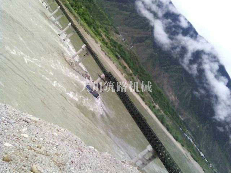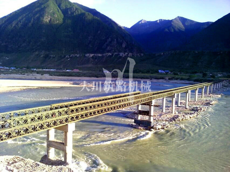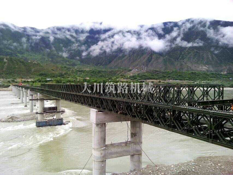 特點:本鋼橋拉薩到林芝鐵路控制性工程的重要組成部分,滿足荷載80T施工車輛通行。主河道水流急,橋墩高,經(jīng)多方多次論證和設(shè)計,最后采用了24+24+24+42+42+24M三排雙層單層混合型加強型雙橫梁下承式鋼橋。克服了施工難度大、氧氣較稀薄等因難因素,采用推出法安裝,于2015年6月通車。